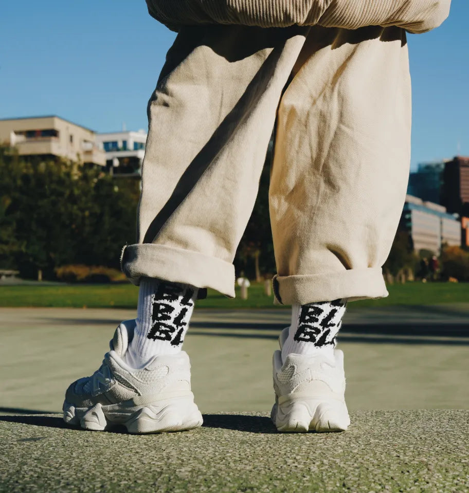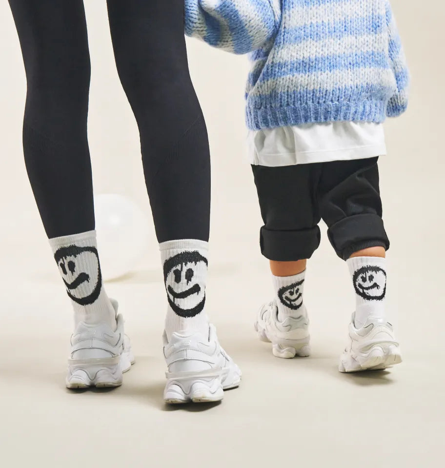 Die Smiley Tennis Socken sind von der Athleisure-Ästhetik der 70er Jahre inspiriert, neu interpretiert im Grunge-Stil der 90er Jahre. Mit einem graffitiartigen Smiley in schwarz-weißen Varianten verleihen sie jedem Outfit einen Hauch von Nostalgie und modernen Flair. Dieses kreative Zusammenspiel von Stilen macht die Socken zu einem einzigartigen Fashion-Statement für Eltern und Kinder gleichermaßen.